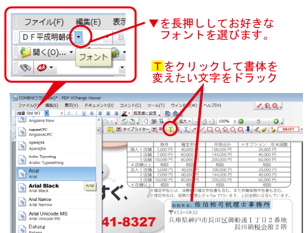 先ずは、ツールバーのTを選択し変えたい文字をクリックしドラックします。フォント一覧の中からお好きなフォントを選びます。